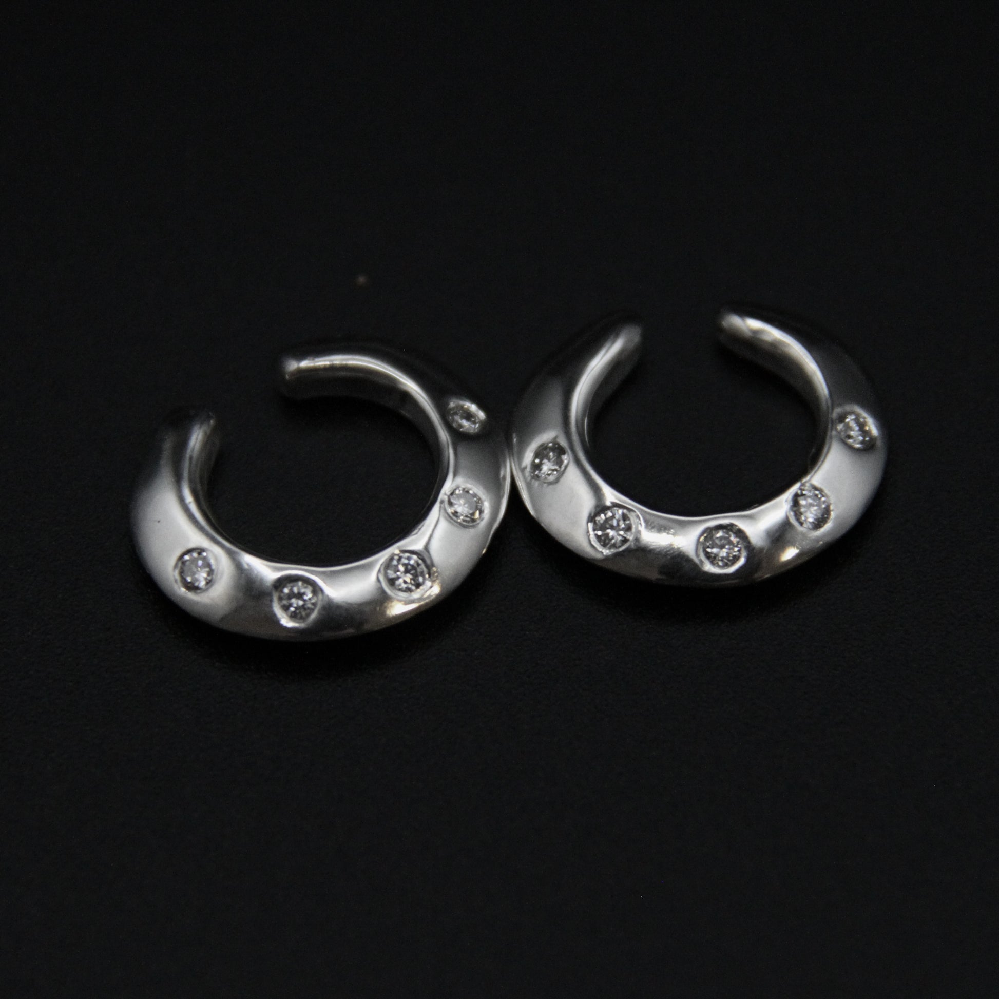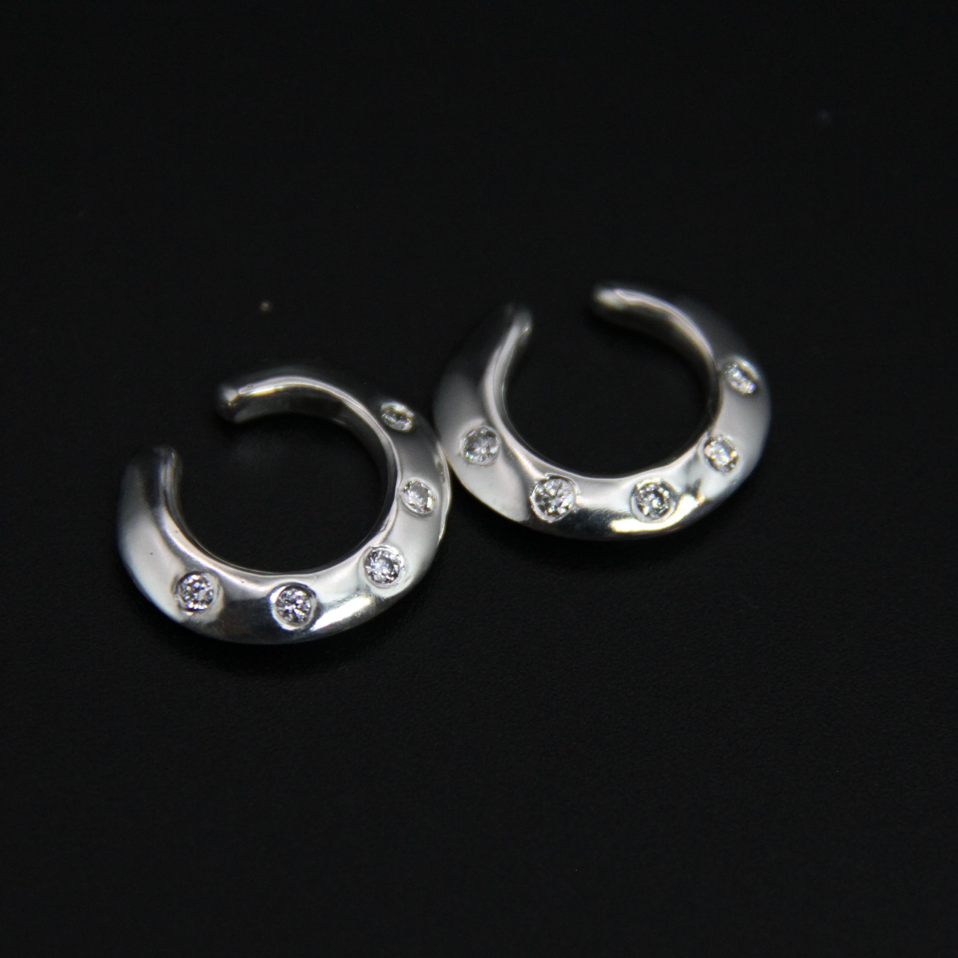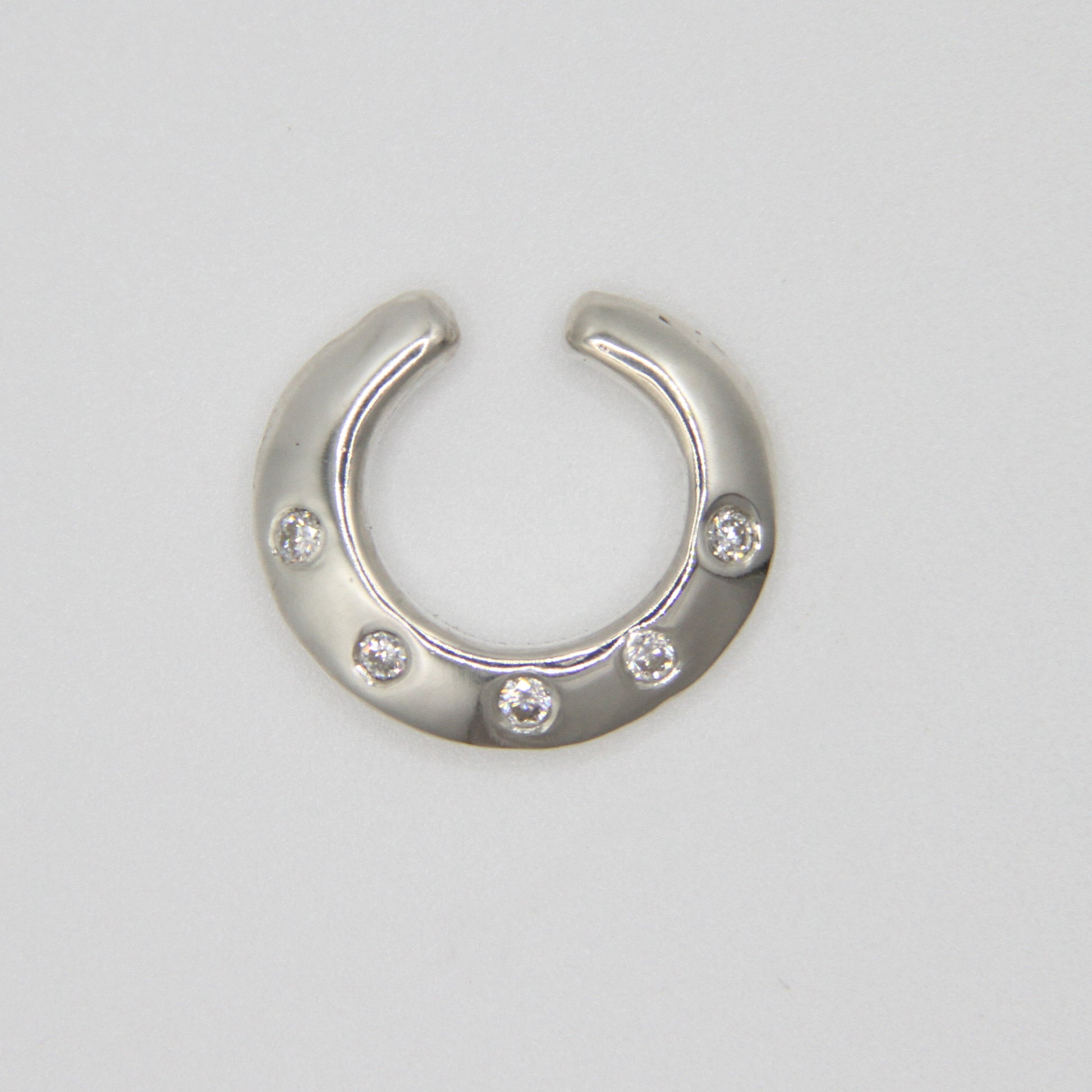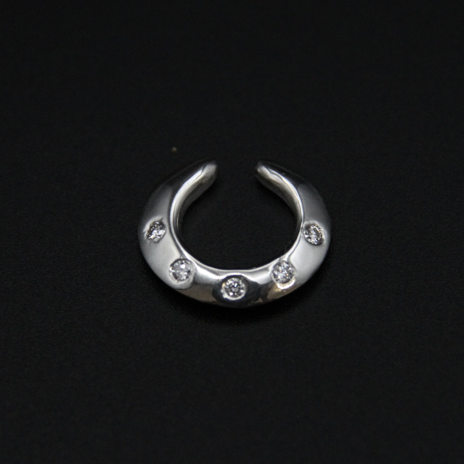 Solid sterling silver ear cuff set with five small diamonds or sapphires, and a shiny mirror finish. A sleek outer knife-edge shape with soft, rounded edges where the cuff comes into contact with your ear.